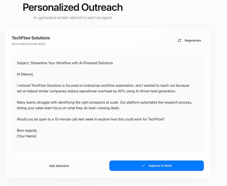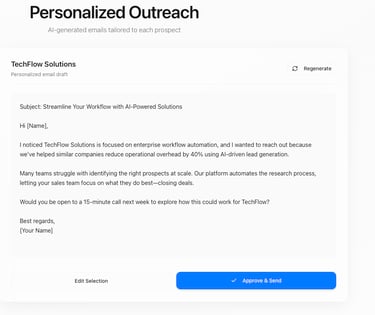 Our Lead Generation Agent brings everything together — prospecting, targeting, and outreach — in one simple, intuitive workflow. And because every business works differently, we personalise the entire experience to your goals, preferences, and brand.